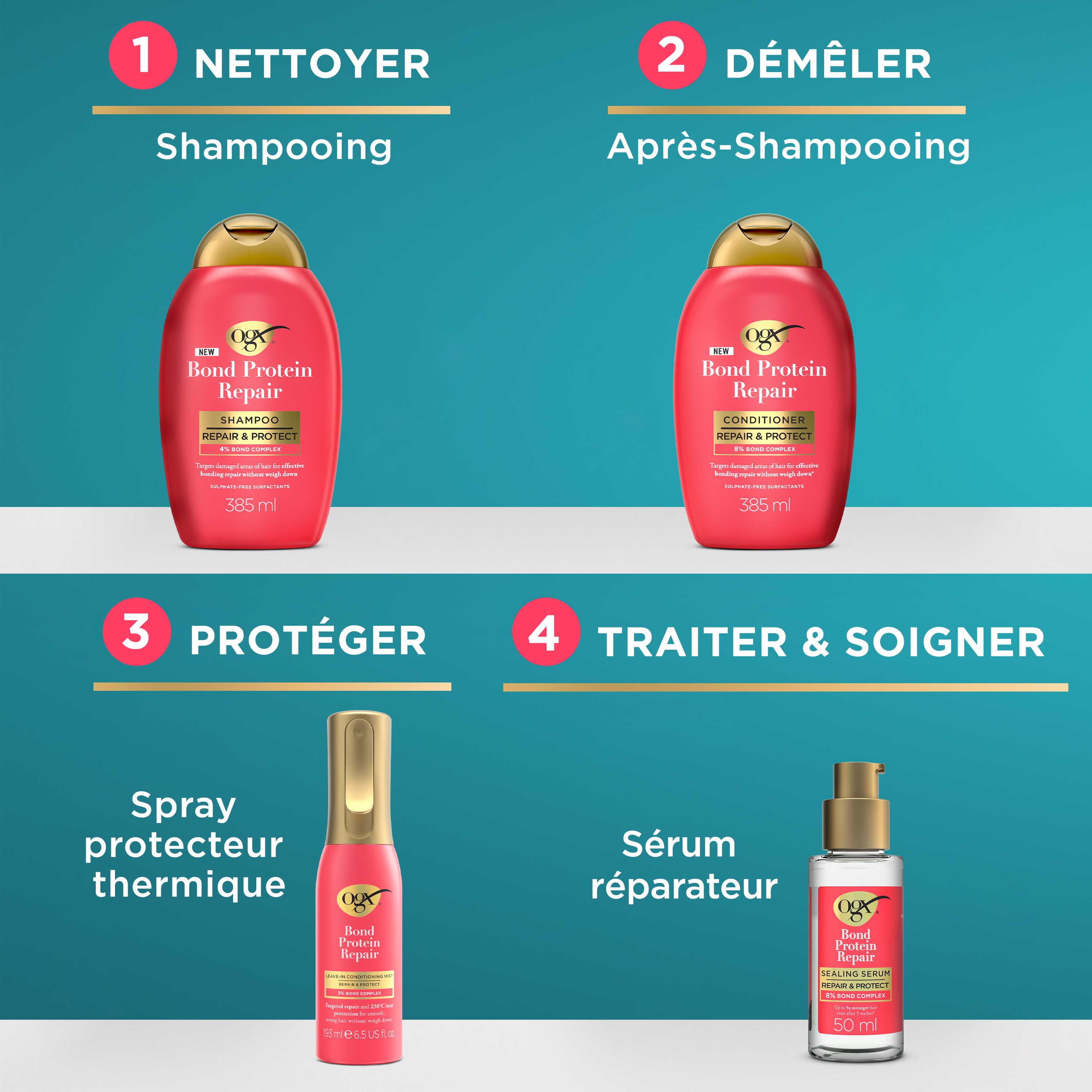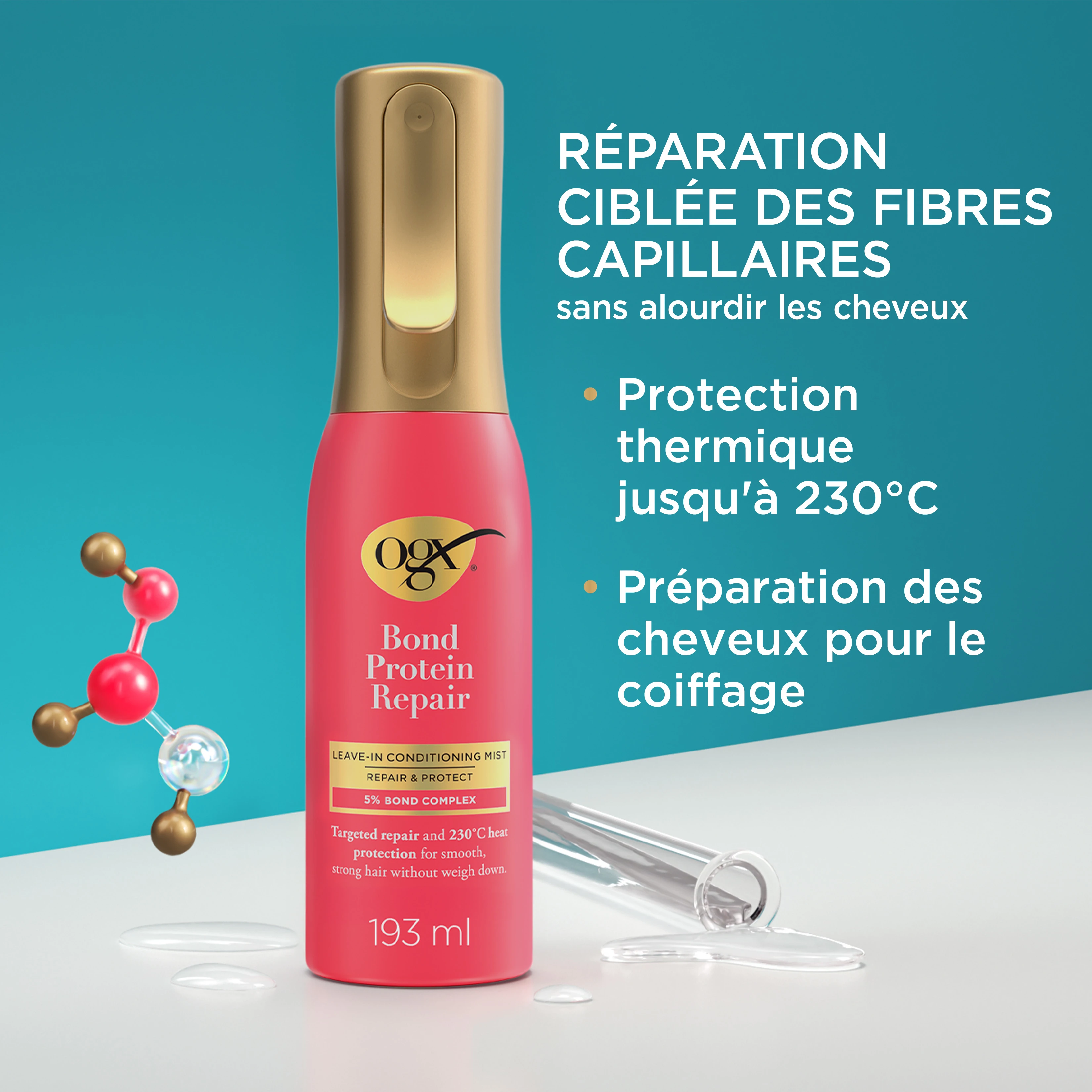 Réparez et protégez vos cheveux avec le spray réparateur sans rinçage OGX avec une protection thermique jusqu'à 230°C. Formulé avec le complexe OGX Bond Protein pour cibler les zones abîmées des cheveux et réparer efficacement les fibres capillaires sans les alourdir. Ce spray protecteur offre un soin léger pour des cheveux plus doux, plus forts et prêts à être coiffés*. Il protège également les cheveux des appareils chauffants jusqu'à 230°C. Utilisez ce soin sans rinçage sur cheveux humides avant le brushing ou le coiffage. Obtenez 80 % de casse en moins et 6 fois plus de protection**. Ce fortifiant capillaire est le complément idéal à votre routine de soins. Obtenez le brushing parfait sans abîmer vos cheveux grâce au spray réparateur sans rinçage OGX Bond Protein Repair, avec protection thermique 230°C. Combinez-le avec l'ensemble de la gamme OGX Bond Protein Repair pour nettoyer, réparer, protéger et coiffer.